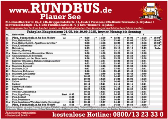 Die Zislower Kurkarte (vom Gastgeber oder am Automaten am Konsum, „Zum Hafen 1“) ermöglicht Ihnen Ausflüge auf und um den Plauer See: per Bus und Schiff. Und das für mehr als wenig Geld: 100% auf den Rundbus um den Plauer See, 50% auf Fahrten mit der Blau-Weißen Flotte ab Zislow. Und das schöne daran: die Fahrpläne von Bus und Schiff sind aufeinander abgestimmt.