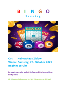 wir einen gemeinsamen Mittagstisch für Zislow im Heimathaus anbieten. Damit der Touristik- und Heimatverein weiß, wie viele sich dafür interessieren, bitten wir um eine telefonische Anmeldung unter