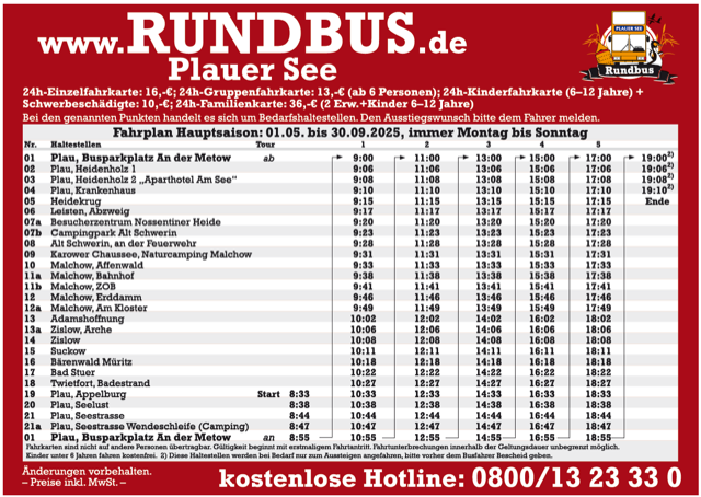 16:30 mit dem Schiff ab Zislow nach Malchow. Am Kloster Malchow um 17:49 mit dem Rundbus zurück nach Zislow. Oder Sie starten schon morgens um 10:08 mit dem Bus ab Zislow, besuchen den Bärenwald, fahren dann um 12:18 ab Bärenwald mit dem Rundbus nach Plau, schauen sich die schöne Stadt an und nehmen von dort um 14:50 den Dampfer zurück nach Zislow.